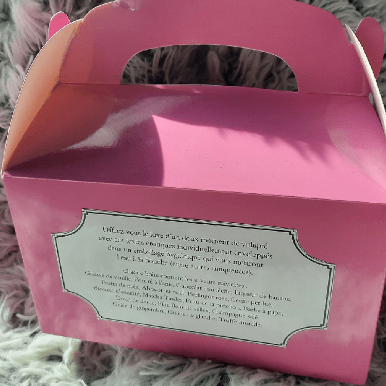 La boîte de Bouchées fourrées contient dix-huit courts textes érotiques enveloppés individuellement dans un emballage hygiénique. Parfois un poème, parfois un court récit en prose, vous irez de surprise en surprise en effeuillant ces capsules colorées qui vous livreront leurs secrets en vous faisant passer par toute la gamme des émotions. Vous y trouverez de tout: du comique, du sublime, de l’obscène, du scandaleux.