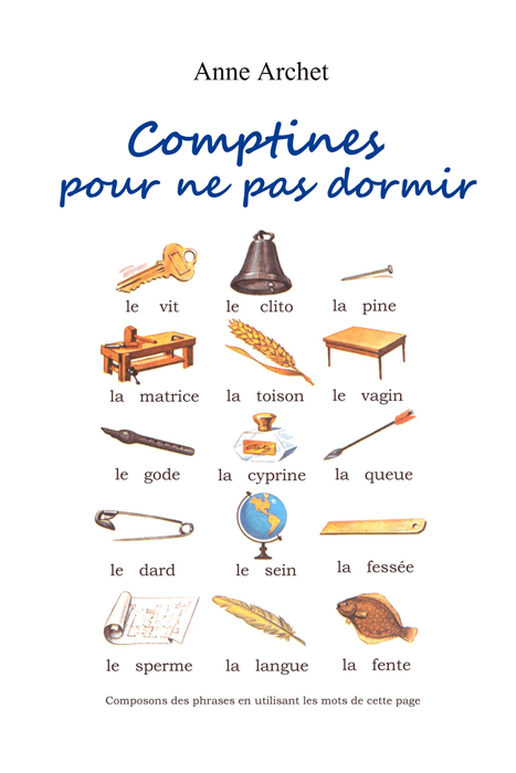 Quand j’étais gamine, j’adorais les gros mots, ceux que je n’avais pas le droit de dire – du moins, quand un adulte était dans les parages. J’aimais aussi les comptines, même si je trouvais ça souvent neuneu, particulièrement quand c’était l’institutrice qui les récitait, pour nous les enseigner. Maintenant que je suis grande (et que j’ai toujours huit ans d’âge mental), j’ai décidé de joindre mes deux amours d’enfance en inventant et en adaptant plus de soixante-dix comptines grivoises. Laissez-moi ruiner avec amour vos souvenirs d’enfance ❤️